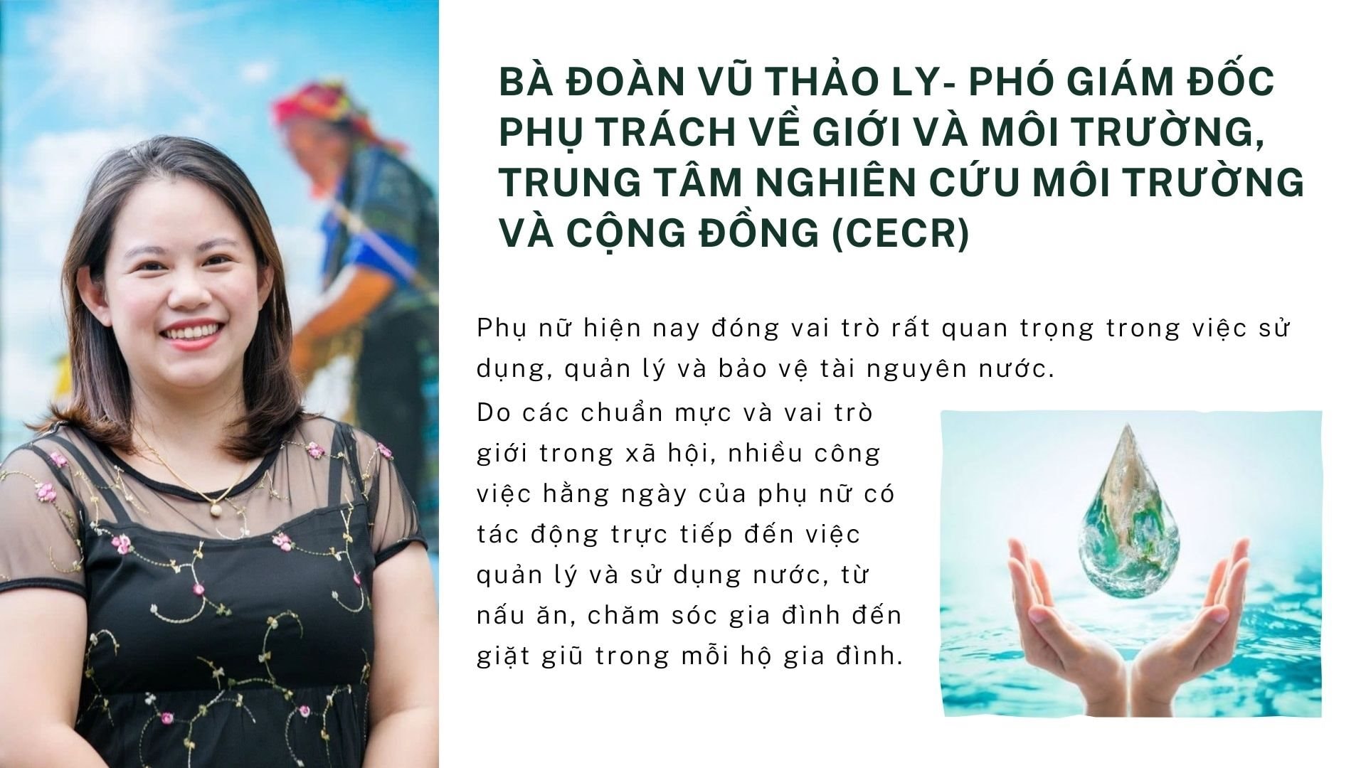In the context of water resources facing numerous challenges such as dwindling reserves, environmental pollution, and the increasingly evident impacts of climate change, the role of communities in water resource protection becomes particularly important. Among them, women are considered a core force because they are directly involved in water use and management in their daily lives.