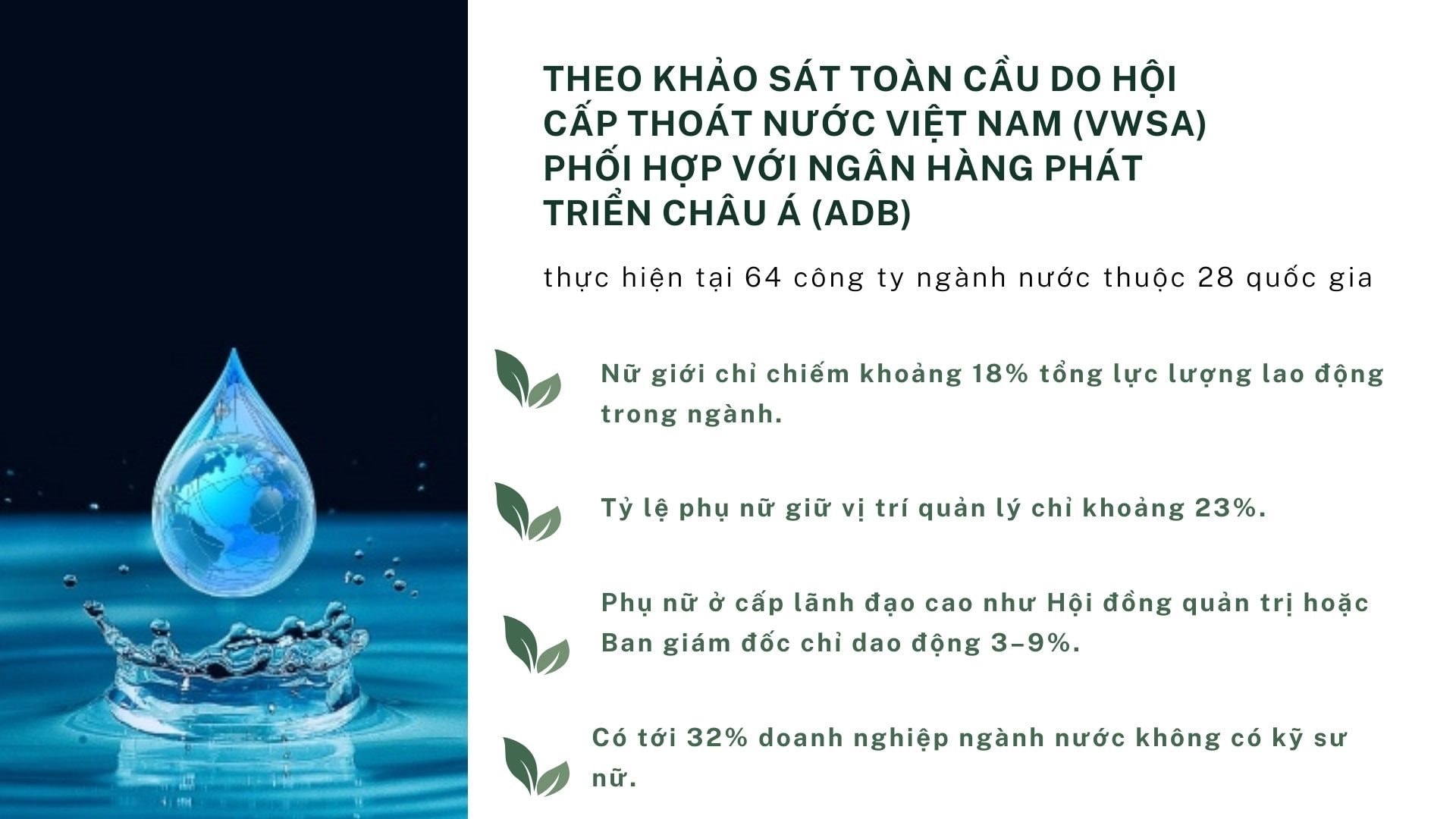 According to a global survey conducted by the Vietnam Water Supply and Drainage Association (VWSA) in collaboration with the Asian Development Bank (ADB) across 64 water companies in 28 countries, women account for only about 18% of the total workforce in the industry. The percentage of women in management positions is only about 23%, while at higher leadership levels such as the Board of Directors or Management Board, the figure ranges from 3–9%. Notably, as many as 32% of water companies do not have female engineers.